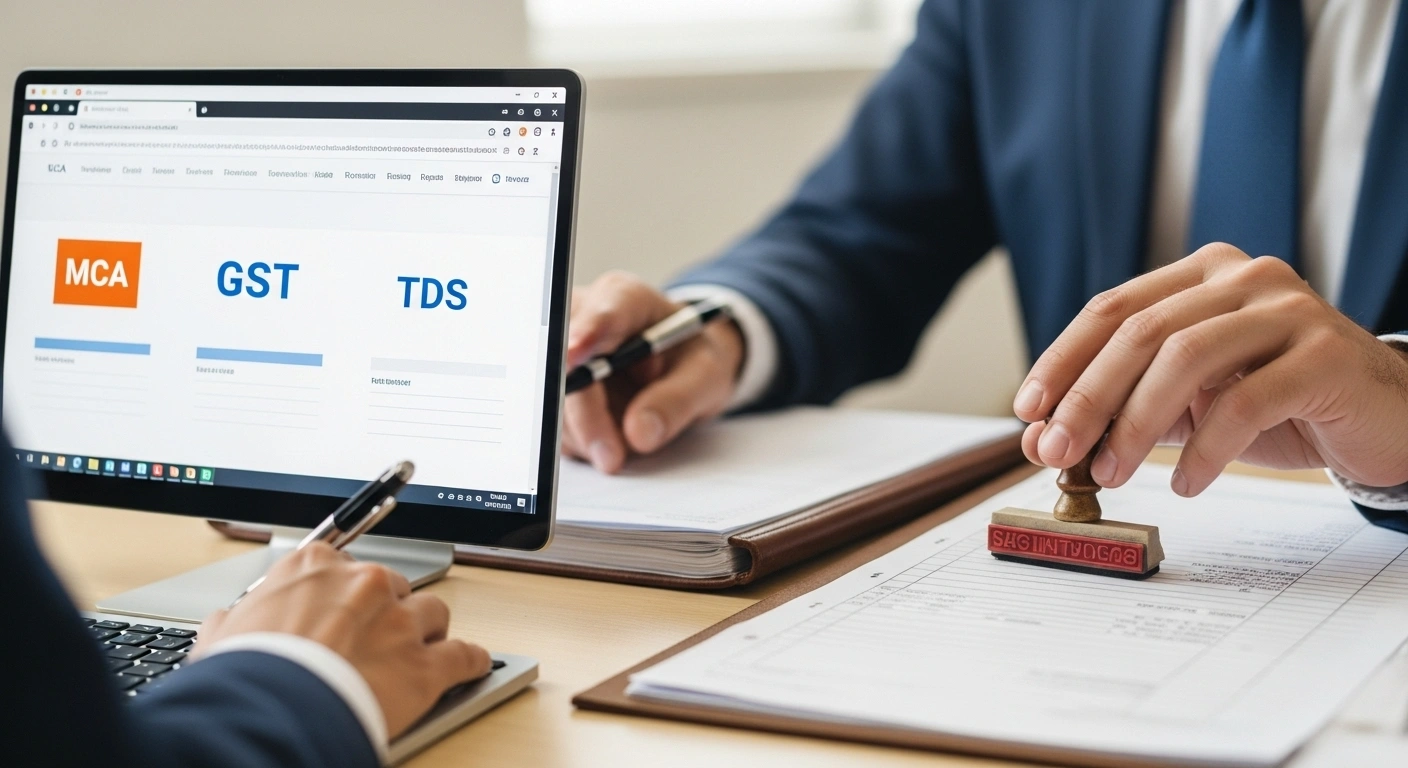 Complete assistance with Private Limited, LLP, or OPC company registration, SPICe+ forms, and ROC/MCA annual compliance.
